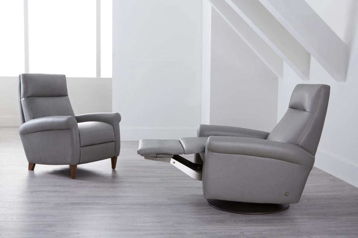 The Adley features a patented reclining mechanism, with a footrest and back that operate independently. Choose from a swivel-base or stationary legs. Make the Adley yours with choice of any leather, fabric — including performance options — or bring your own covering.