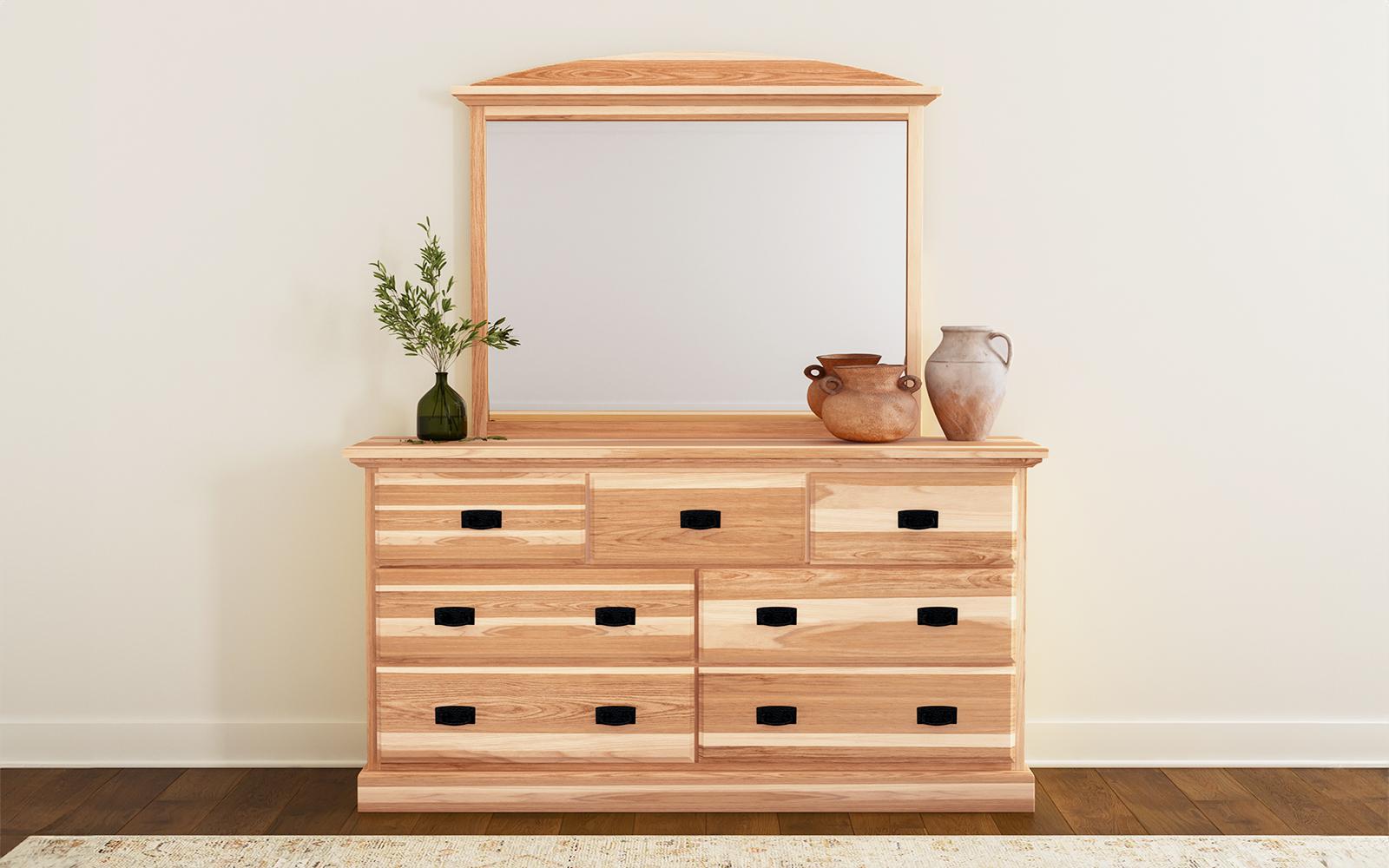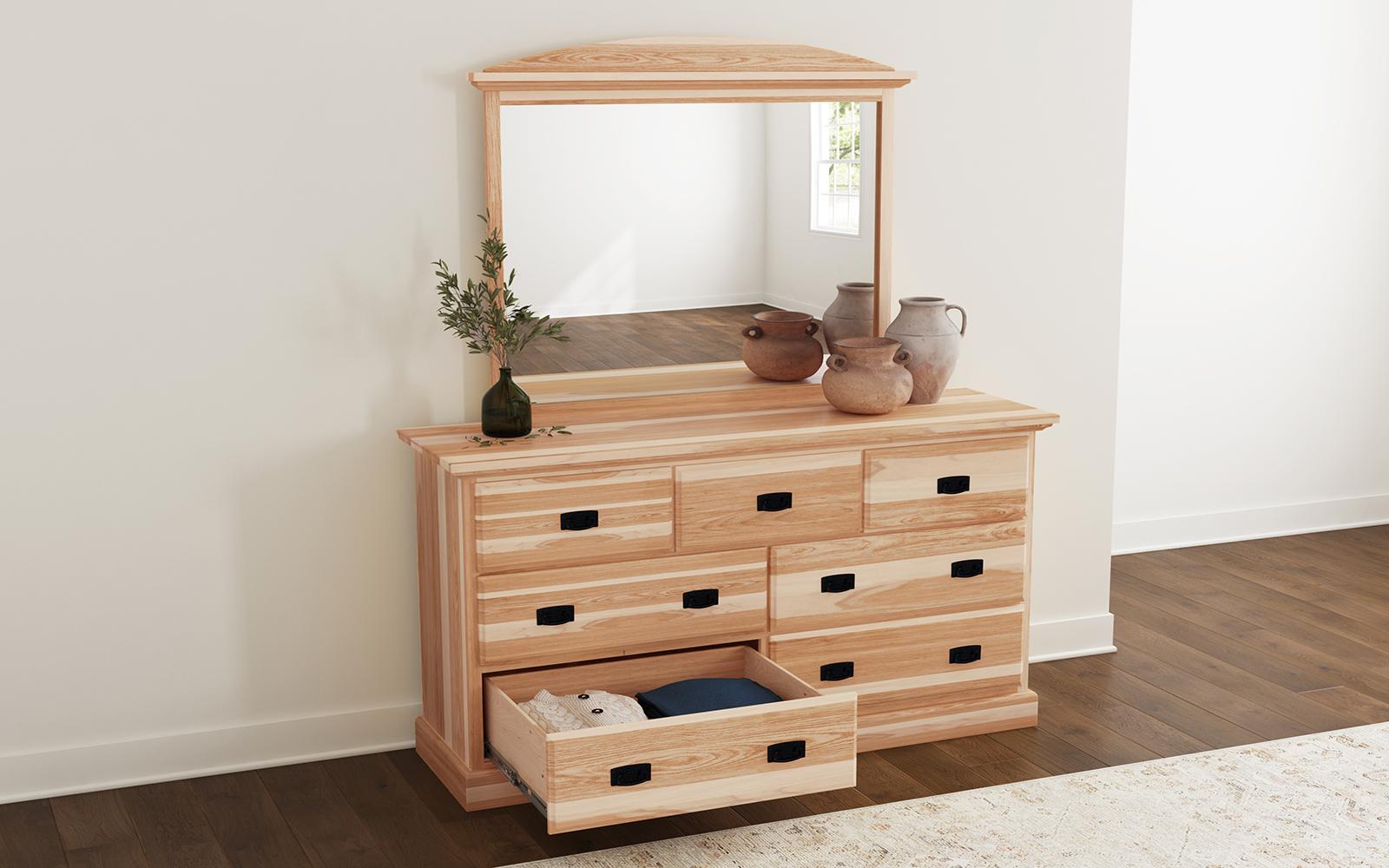 This hickory dresser drawers have solid fronts and are English dovetailed throughout.