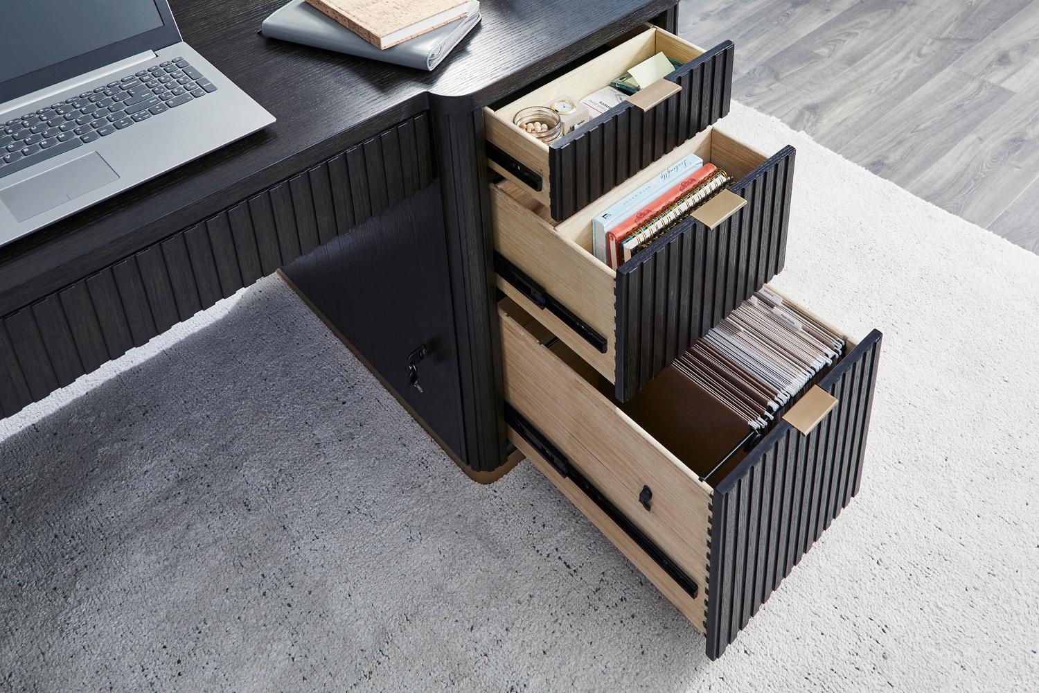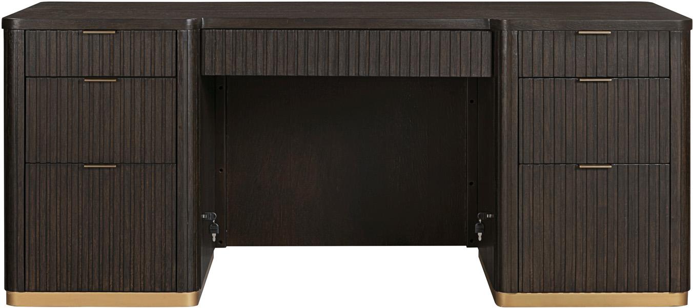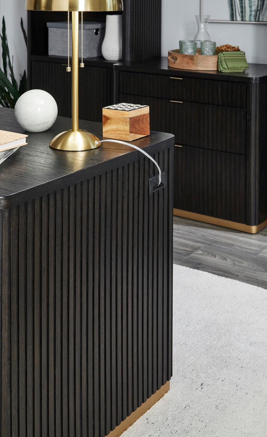 Defined by a rich deep-brown finish and dramatic wood grain, this office collection pairs sleek metal accents with champagne-finish lip pull hardware for a refined edge. The reeded detailing adds dimensional texture to its modern, minimalist design, showcasing a masterful blend of materials. Every piece is intentionally designed to elevate the workspace with smart functionality and modern appeal.