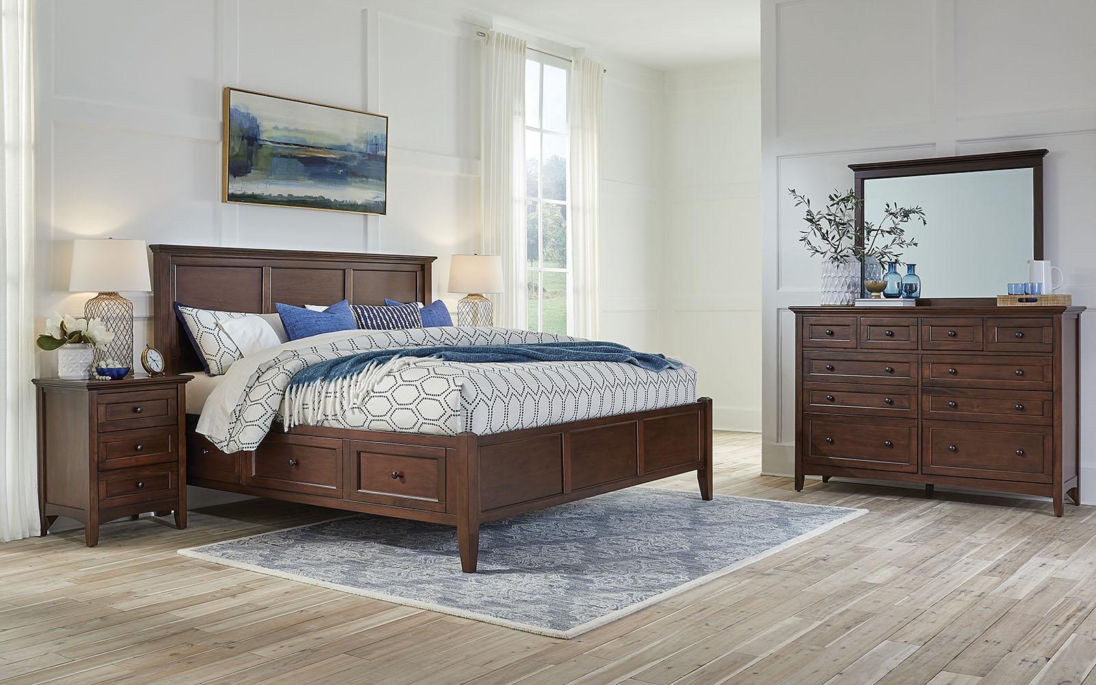 All solid Albasia drawer boxes are dovetailed with 3 tier heavy-duty full extension glides. This cherry brown finished bedroom collection features dark gun-metal color hardware.